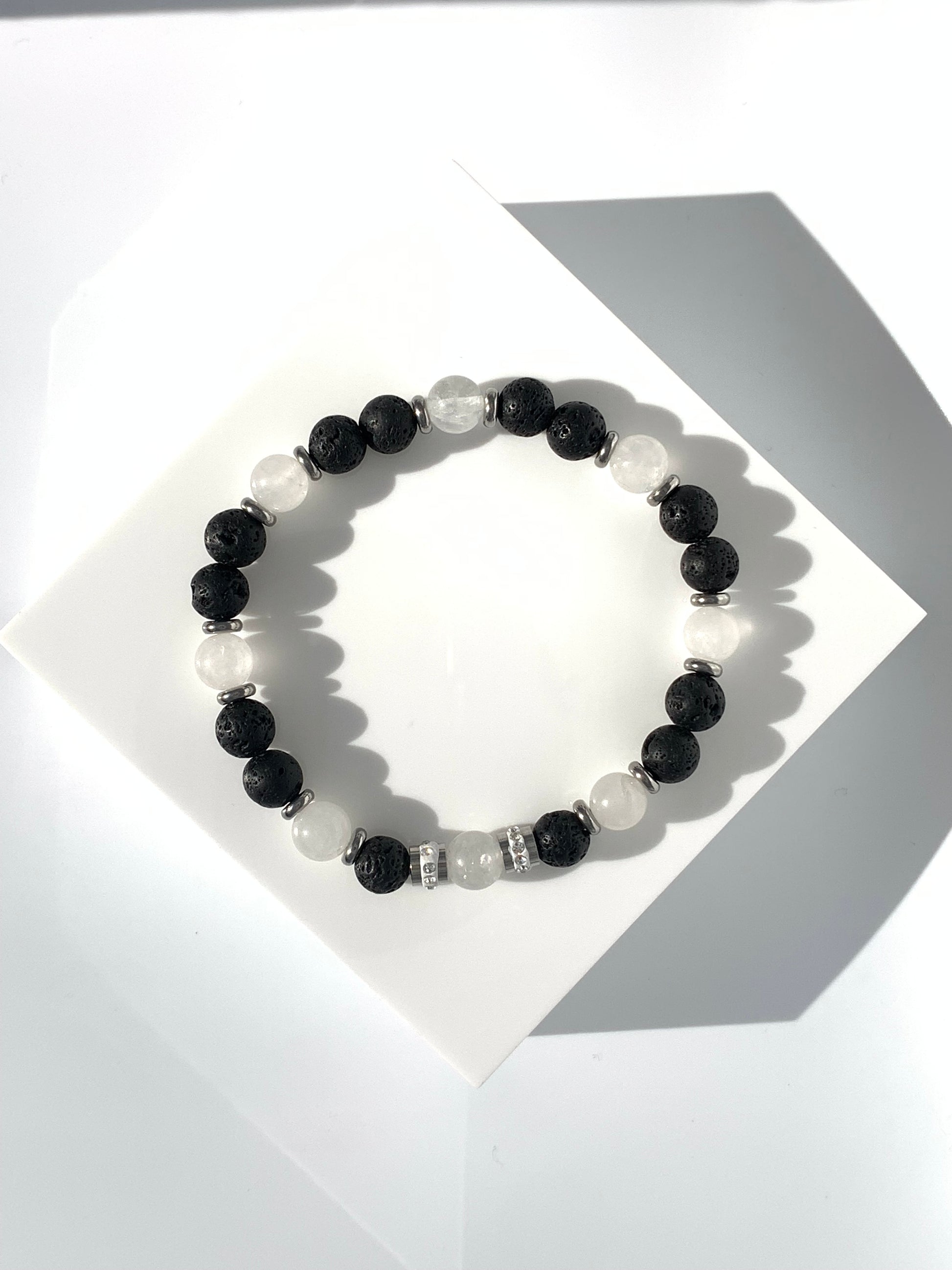 • Materialien: Lavasteinperlen, Bergkristallperlen, Edelstahl-Zwischenperlen, funkelnde Edelstahlperle