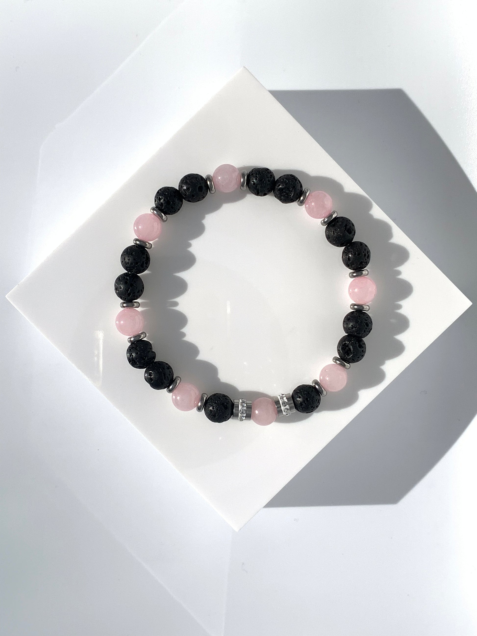Dieses einzigartige, handgefertigte Armband vereint die sanfte Energie des Rosenquarzes mit der kraftvollen Erdung des Lavasteins. Edelstahl-Zwischenperlen und eine funkelnde Edelstahlperle setzen elegante Akzente.